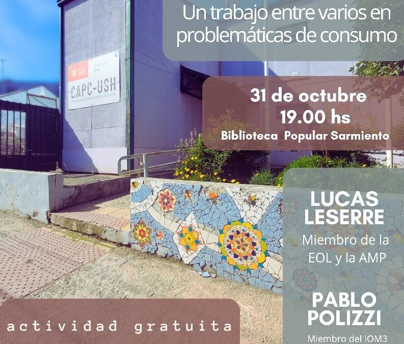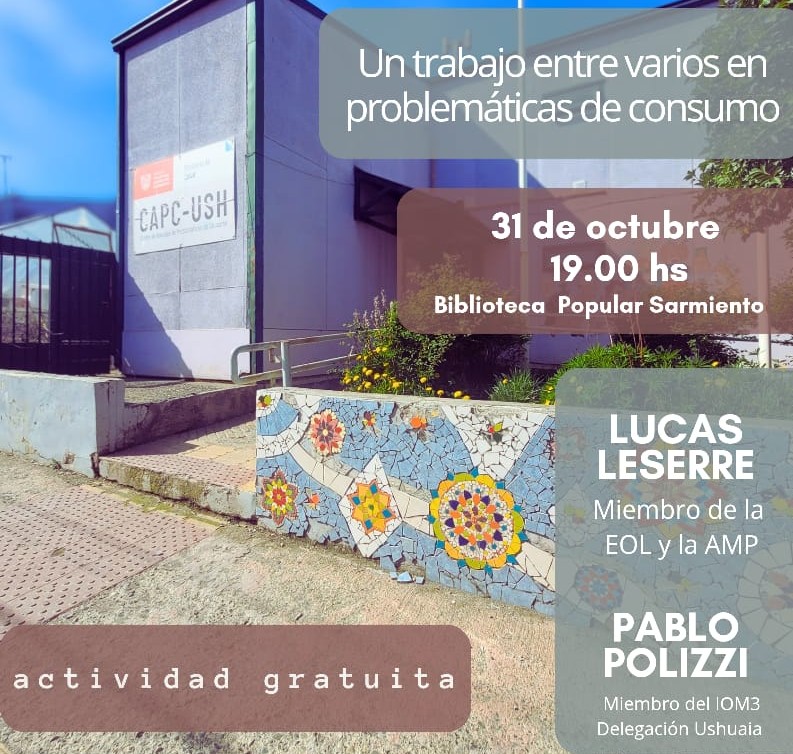 Este viernes 31/10 conversan Lucas Leserre, miembro de la EOL y la AMP, junto a Pablo Polizzi , miembro de la Delegación Ushuaia del IOM3 sobre consumo problematico.Es una actividad destinada a profesionales de Salud Mental.Los esperamos!